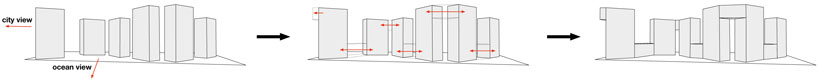 (from left to right) six towers with maximum exposure to the ocean and downtown, connect the towers to create larger penthouses and garden units, diagram of final design