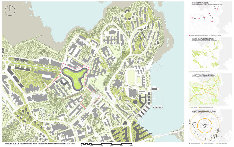 allows for organisation of the transport system as a ‘quad – green heart’, making it completely car free. users can arrive here from the two